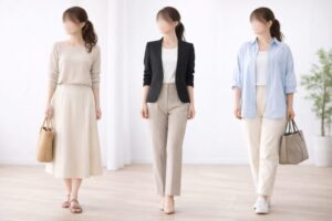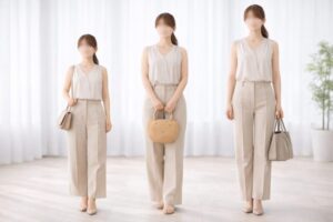また、色合わせも重要なポイントです。ベーシックカラーでまとめると落ち着いた印象に、淡いカラーでまとめるとやわらかく女性らしい雰囲気に仕上がります。