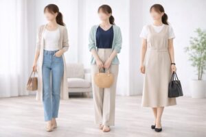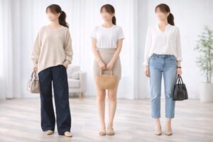 反対に、上下ともゆるいシルエットにすると、着こなしによってはぼんやり見えることがあります。その場合は、ウエストマークやアクセサリーなどで視線を上に集めると改善しやすくなります。
