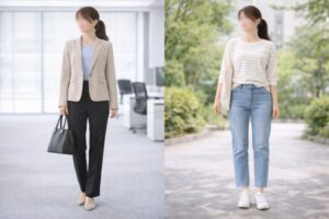 一般的には、きれいめに見せやすいワイドパンツのほうが仕事向きとされることが多いですが、職場のドレスコードや素材・デザインによってはバギーパンツでも対応可能な場合があります。職場の雰囲気にもよりますが、落ち感のある素材やシンプルな色なら使いやすいことが多いです。