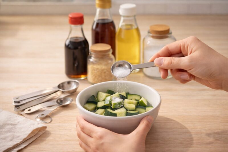 浅漬けでは、野菜の水分と合わさることで味が広がるため、溶けやすい調味料が向いています。昆布茶や白だしを少し加えるだけで、全体がまとまりやすくなります。 - 和え物:昆布茶+少量の砂糖/海苔・かつお節を足す