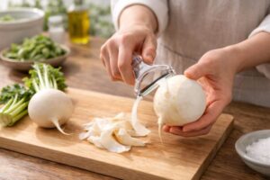 皮をむく場合は、やみくもに全部取り除くのではなく、ポイントを押さえて下処理をすることで、仕上がりがぐっと良くなります。かぶは皮のすぐ下に旨みがあるため、むきすぎないことが大切です。