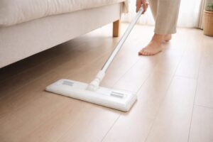 ベッドを動かさずに掃除する場合は、「道具選び」と「動かし方」がポイントになります。長柄タイプのワイパーや延長ポールを使えば、無理な姿勢にならずに奥まで届きます。さらに、ワイパーを左右に細かく動かすよりも、奥から手前へ一方向で動かす方がゴミを効率よく集められます。床に物があると動きが制限されるため、あらかじめ軽く片付けておくと作業がスムーズになります。