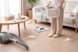 掃除前に床に置いてあるものを少し寄せる、窓を開けて軽く換気する、シートやゴミ袋を先に準備しておくなど、小さな工夫で取りかかりやすくなります。掃除そのものよりも、準備が面倒に感じることも多いので、そこを簡単にしておくのがポイントです。